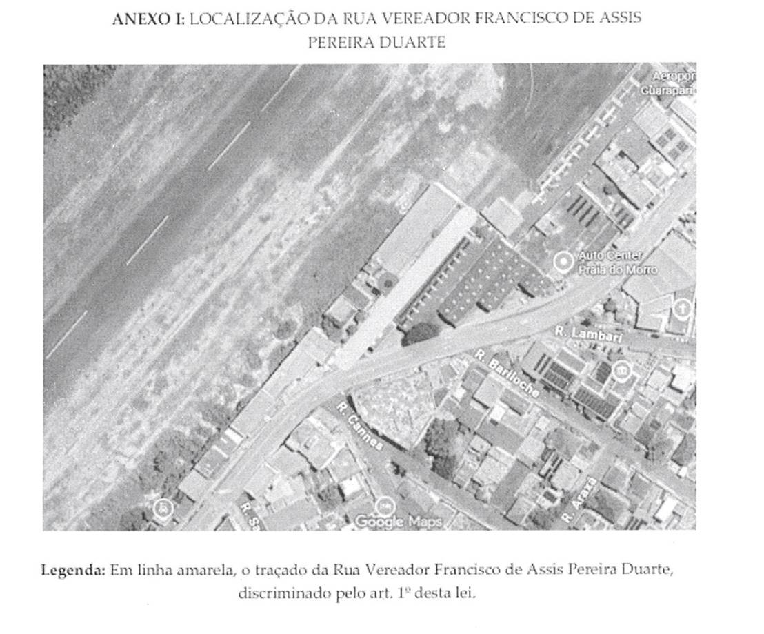 Art. 1º Fica denominada Rua Vereador Francisco de Assis Pereira Duarte, atualmente parte da Avenida Brasil, com coordenadas 20º38'53.3"S 40º29'30.2"W, do loteamento "Bairro Praia do Morro", no trecho que se confronta, por um lado, com os Lotes 08, 09 e 10 da Quadra n. 65 do mesmo loteamento e, pelo outro lado, com parte da "Gleba da Fazenda Santa Rosa"